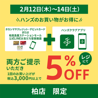 【柏店限定】ハンズアプリ会員限定 5%OFFキャンペーン開催! 2/12(木)~2/14(土)の期間中に、『ハンズクラブアプリ』と『タカシマヤクレジットカード・タカシマヤデビットカード』または『柏髙島屋ステーシ…... 詳細を見る